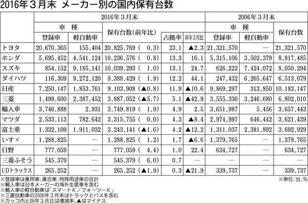 ◆減少傾向の中 管理台数引き上げが鍵 2016年3月末時点のメーカー別国内四輪車保有台数で、スズキが1千万台超えを果たした。乗用車メーカー8社で、登録車と軽自動車ともに前年を上回ったのはスズキとトヨタ自動車のみだった。10年前と比べて保有...