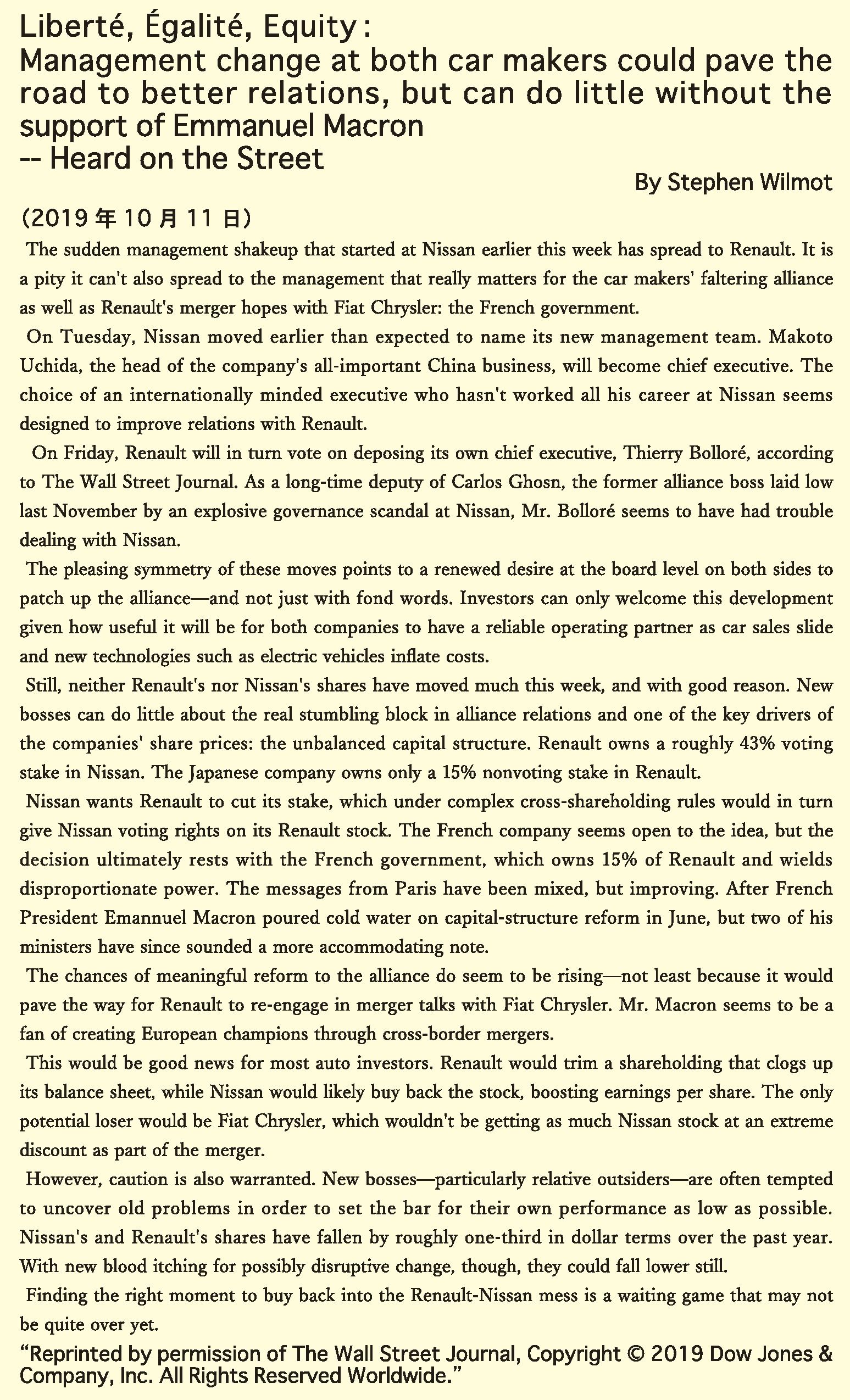 By Stephen Wilmot 2019 年 10 月 11 日  ――WSJの人気コラム「ハード・オン・ザ・ストリート」 日産自動車で今週始まった突然の経営陣刷新は、仏ルノーに広がった。それがフランス政府にも広がらないのは残念だ。揺ら...