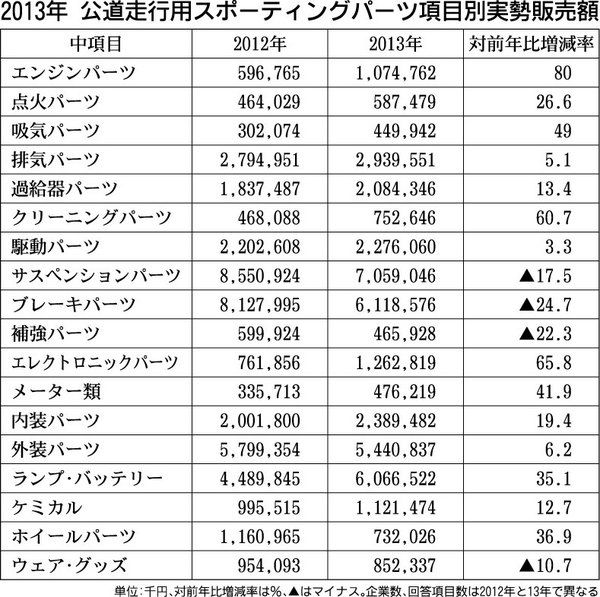■著名ブランド売上高伸ばす 日本自動車用品・部品アフターマーケット振興会(NAPAC、田中毅会長)は、2013年のスポーティングパーツ市場に関する調査をまとめた。その結果、調査対象のパーツ104品目の実勢販売総額は、前年比0・7%増の42...