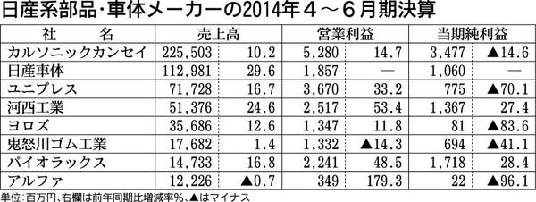 日産系部品メーカー7社の2014年4~6月期の決算は、売上高が前年同期比12・4%増、営業利益が同24・9%増と大幅な増収増益となった。日産自動車の生産増を反映し、主に北米と欧州で売上高が増加した。アジアは中国の売り上げが増加したものの、...