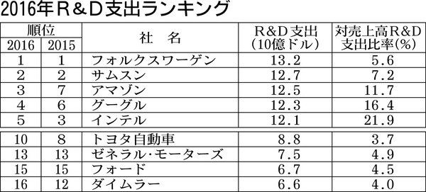 ストラテジーコンサルティング(東京都千代田区)は26日、2016年の研究開発(R&D)支出調査でトヨタ自動車が10位にランクインしたと発表した。総合トップはフォルクスワーゲン(VW)で、トヨタは自動車メーカーの中では2番目。支出額はVWが...