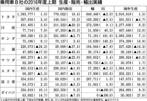乗用車メーカー8社が27日発表した2016年4~9月(上期)の生産・販売・輸出実績によると、8社合計の世界生産台数は、海外生産の増加により前年同期比3・0%増の1345万台となった。主に市場が好調な北米や中国での生産が増加した。国内生産は...