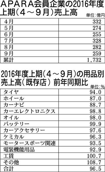 自動車用品小売業協会(APARA、小林喜夫巳会長)に加盟するカー用品量販店の2016年度上期(4~9月)の売上概況がまとまった。売上高は前年同期比(既存店ベース)3・5%減の1732億2778万円となった。前年度の降雪が少なかったことから...