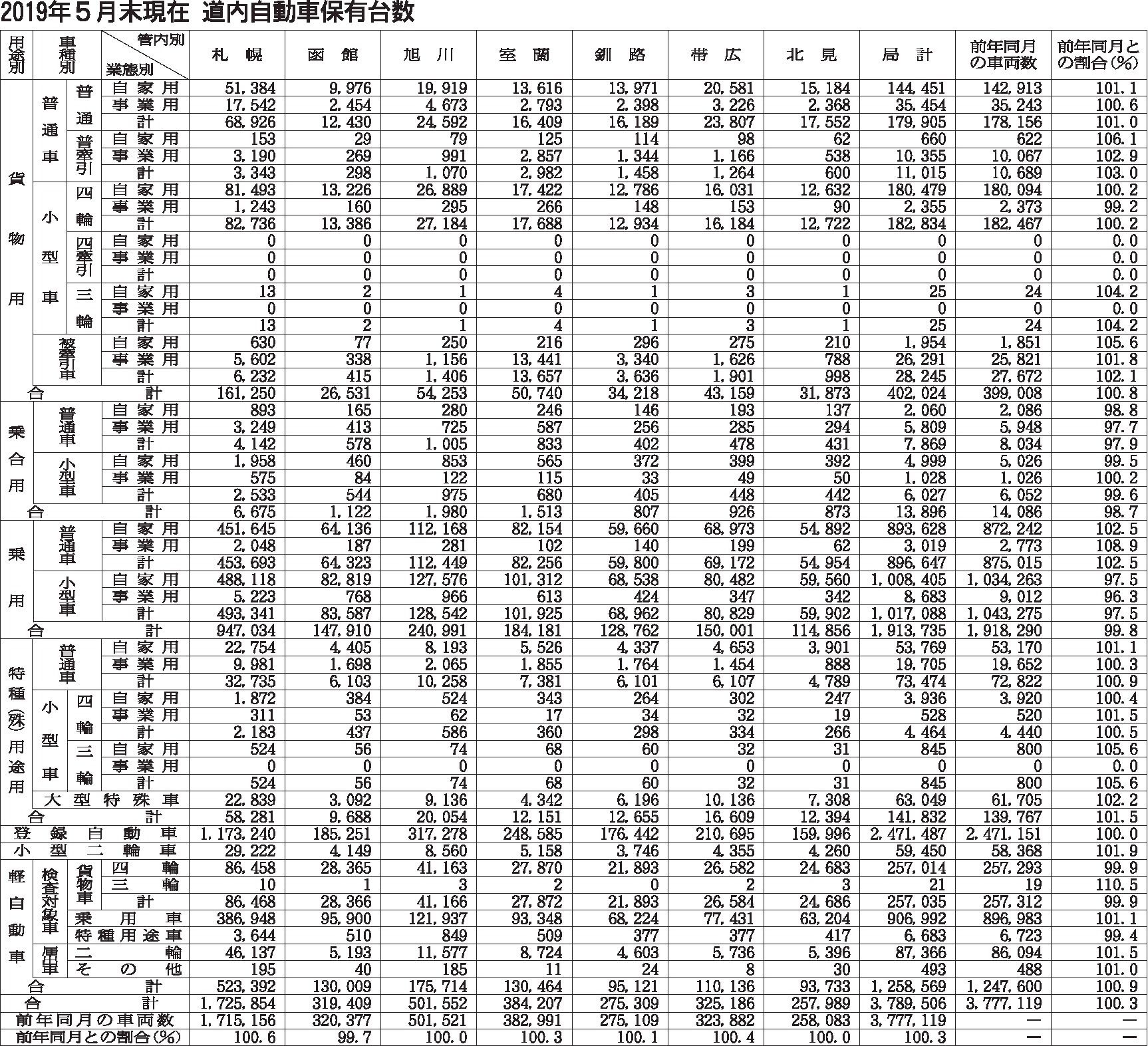 2019年 5月末現在道内自動車保有台数