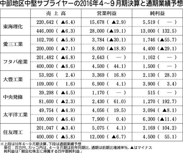 中部地区の中堅部品メーカー7社が27日に発表した2016年4~9月期連結業績は、円高による為替換算差の影響で大豊工業を除く6社が減収となった。ただ、為替変動を除くと実質増収だったことや、合理化、原価改善などの効果もあって5社が営業増益とな...
