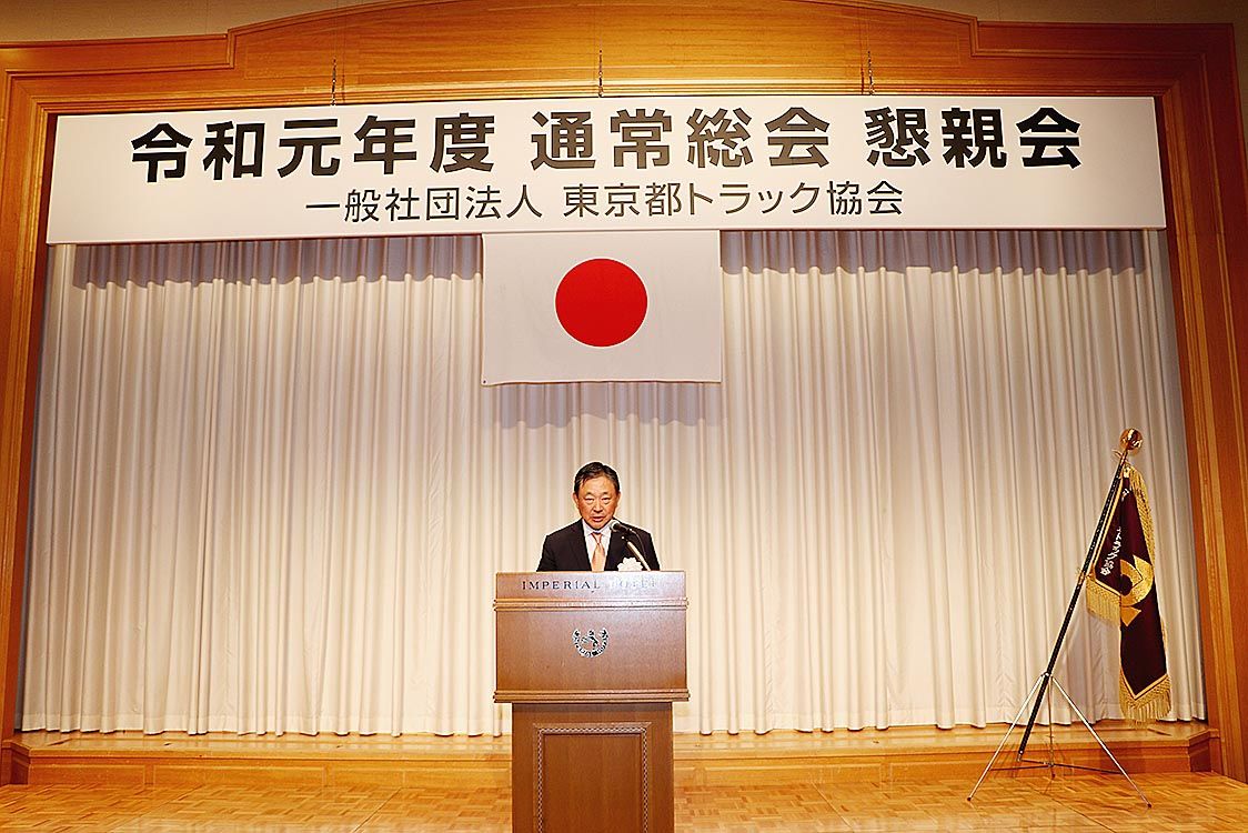 東京都トラック協会(浅井隆会長)はこのほど、都内のホテルで「令和元年度通常総会」を開催した。 役員の選任のほか、平成30年度の事業報告および令和元年度の事業計画を審議し、承認を受けた。 総会後に行われた懇親会で挨拶に立った浅井会長=写真=...