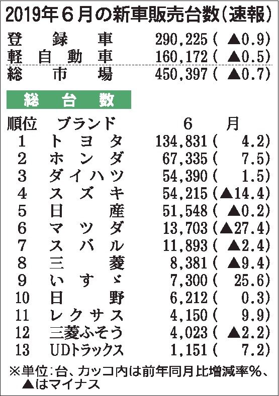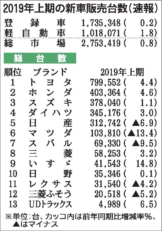 2019年上期(1~6月)の登録車と軽自動車を合わせた新車販売台数は、前年同期比0・8%増の275万3419台となり2年ぶりの前年超えを果たした。登録車も2年ぶり、軽自動車は3年連続のプラスとなった。しかし、6月単月では3カ月ぶりのマイナ...