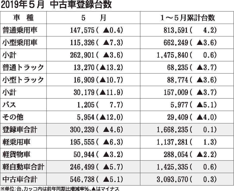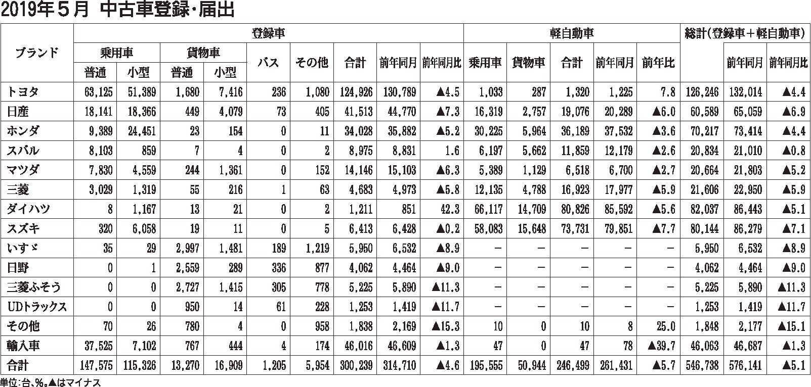 [[大型連休が影響全項目でマイナス5月の中古車登録・届け出]] 日刊自動車新聞社がまとめた5月の中古車登録・届け出台数は、前年同月比5・1%減の54万6738台で2カ月ぶりに減少した。登録、届け出ともにマイナスで、ブランド別でもすべてが減少...