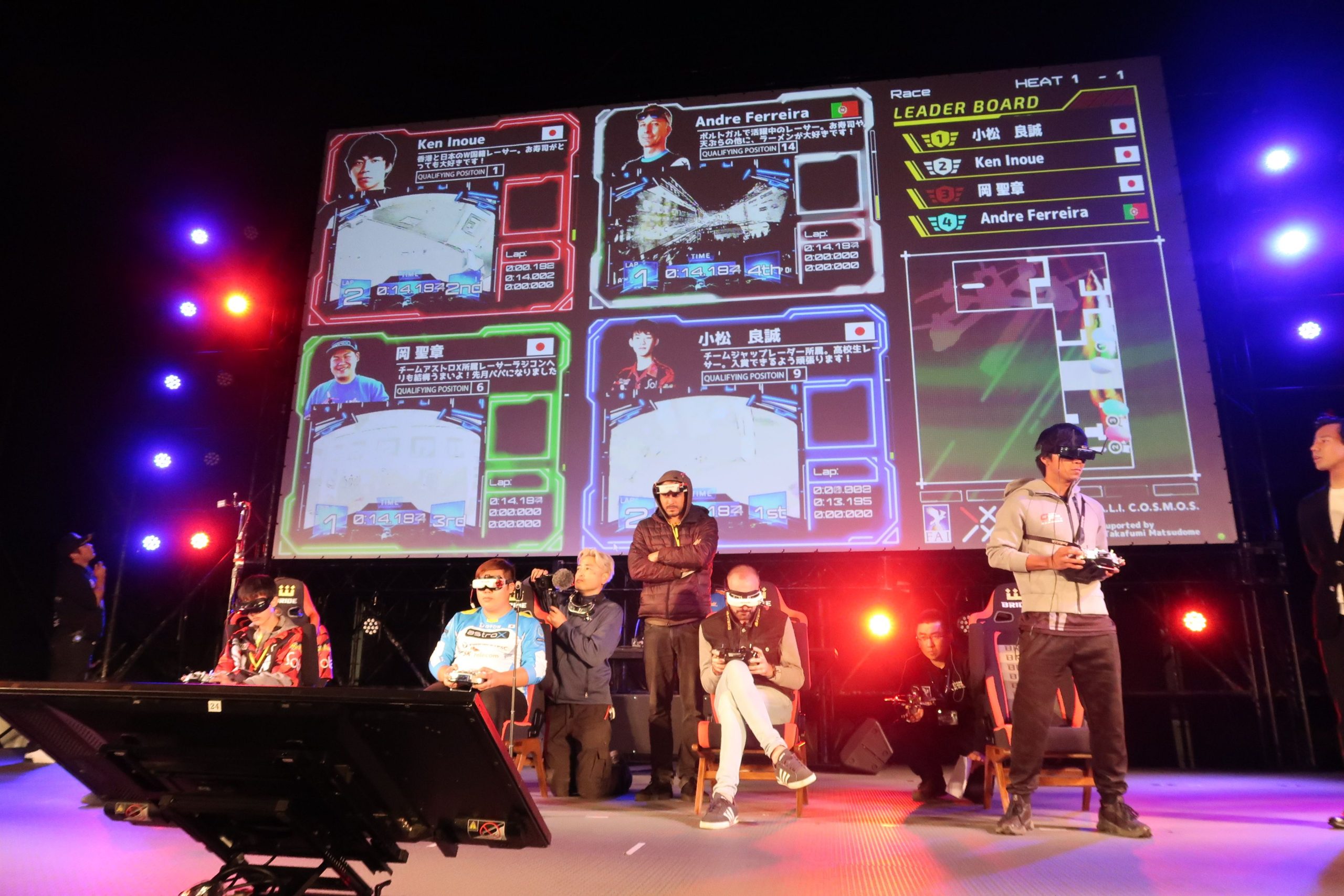 レースは直径約30センチメートルの競技用のドローンを使って1周250メートルのコース3周のタイムを競うもの。選手はドローンに搭載されたカメラの映像をゴーグルのモニターで確認しながら操縦する。