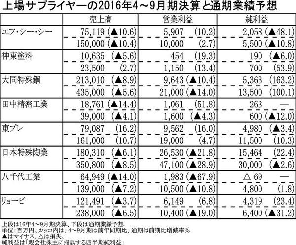 【上場サプライヤーの2016年4~9月期決算と通期業績予想】