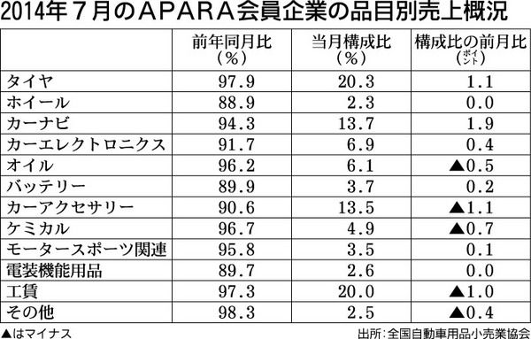自動車用品小売業協会(APARA、森本弘徳会長)が発表した会員企業の7月の売上高は、前年同月比5・2%減の316億8553万円だった。4月から17・1%減、10・5%減、12・8%減と2桁減が続いたが、7月は1桁減に持ち直した。さらに、客...