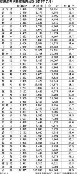 日刊自動車新聞がまとめた2014年7月の都道府県別新車販売台数および軽自動車比率によると、軽比率が最も高かったのは佐賀で56・5%だった。トップ常連の沖縄は40・6%の31位だった。夏のレジャーシーズンを迎え、レンタカーの登録が増えたこと...