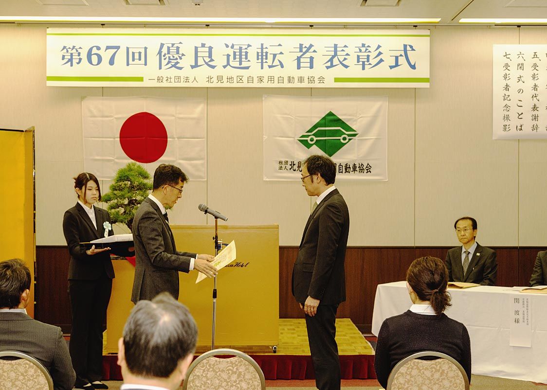 【北見】北見地区自家用自動車協会(松原英行会長)は26日、市内のホテルで「第66回優良運転者表彰式」を開いた=写真。45年表彰の1人を含む40人の優良ドライバーを顕彰した。 冒頭、松原会長は「本日受賞した優良ドライバーは他の模範となり、今...