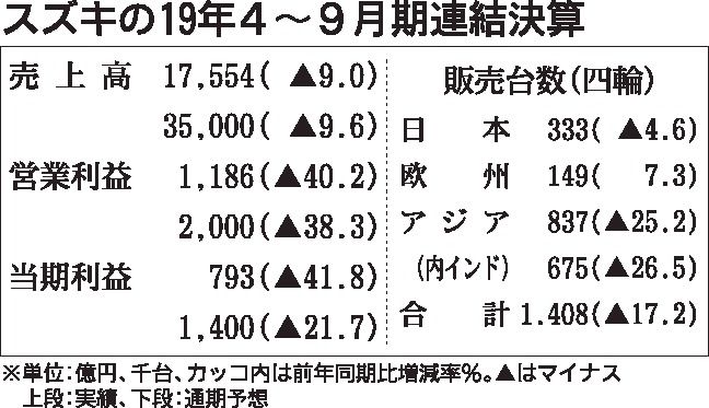 スズキは5日、2019年度上期(4~9月期)の営業利益が前年同期比40・2%減の1186億600万円だったと発表した。完成検査体制の再構築に伴う国内の減産やインド市場の低迷、為替変動などが影響した。各利益項目で上期の新記録だった前年から一...