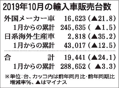 日本自動車輸入組合(JAIA、上野金太郎理事長)が7日発表した10月の外国メーカー車の新規登録台数は、前年同月比21・8%減の1万6623台と4カ月ぶりの前年割れとなった。9月として過去最高だった前月から一転し、10月としてリーマンショッ...