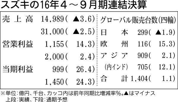 スズキは4日、2017年3月期通期の利益見通しを上方修正して発表した。営業利益は従来予想の1800億円を2千億円に、当期純利益は930億円を1450億円にそれぞれ上方修正した。為替を円高方向に見直したものの、4~9月(上期)業績がインドや...
