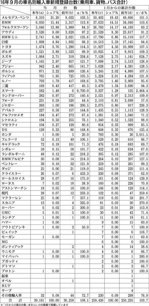 【16年9月の車名別輸入車新規登録台数(乗用車、貨物、バス合計)】