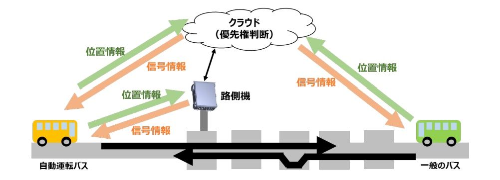 また、無線を使った信号制御についても実証する。車両の位置情報を無線通信で取得し、自動運転バスと対向車両の一方に優先権を信号情報として通知、車両1台分の幅のBRT専用道で交互通行を実現する。無線通信は700MHz帯、LTEに加え、Wi-Fiを併用する。