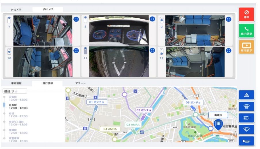 車内に設置したカメラを使って走行中の乗客の席移動などを人工知能(AI)で検知し、オペレーターに自動通知する。乗客の転倒などの事故を防止し、自動運転バスの車内モニタリング機能の効果を検証する。
