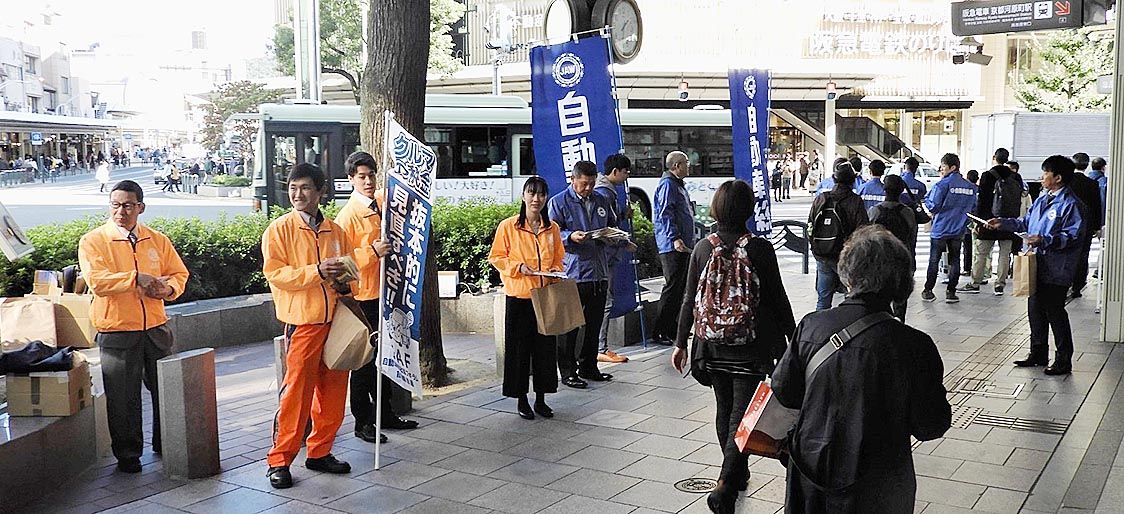 【京都】日本自動車連盟(JAF)京都支部(森川莫臣支部長)は5日、自動車産業労働組合総連合会と日本自動車販売協会連合会とともに京都市内でドライバーの税負担軽減を訴える街頭活動を行った=写真。 街頭活動は四条河原町高島屋前と京都マルイ前で実...