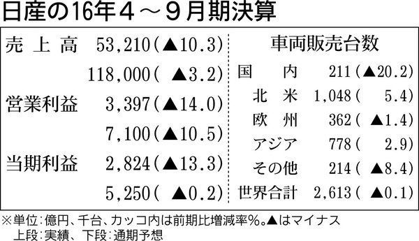 日産自動車が7日発表した2016年4~9月期決算は、円高のマイナス影響を受け、売上高は前年同期比10・3%減、営業利益は同14・0%減、当期純利益は同13・3%減と減収減益だった。為替変動による営業利益段階のマイナス影響は1798億円あっ...