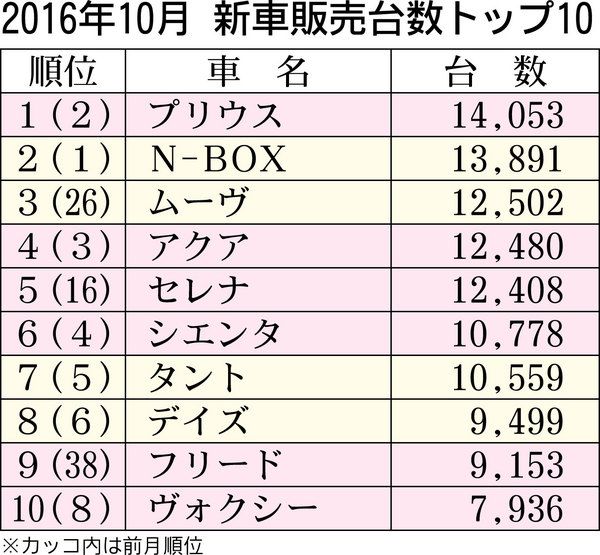 10月の新車販売の車名別順位(軽自動車含む)は、トヨタ「プリウス」が2カ月ぶりに首位を奪還した。2位はホンダ「N―BOX」で、台数差はわずか162台。販売水準は3位以下に大きく差をつけており、当面は2モデルの首位争いが続きそう。3位には「...