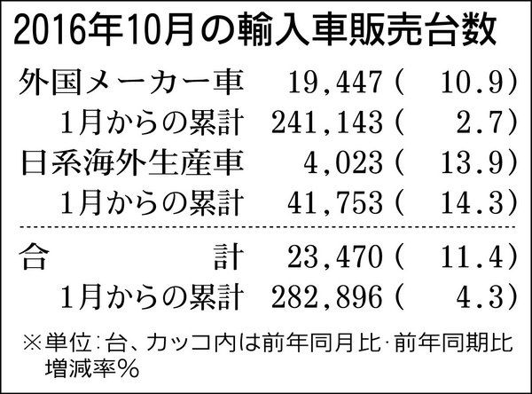 日本自動車輸入組合が7日発表した10月の外国メーカー車の新規登録台数は、前年同月比10・9%増の1万9447台となり、7カ月連続のプラスだった。昨年は独フォルクスワーゲン(VW)によるディーゼルエンジン(DE)車の不正問題で需要が急減した...