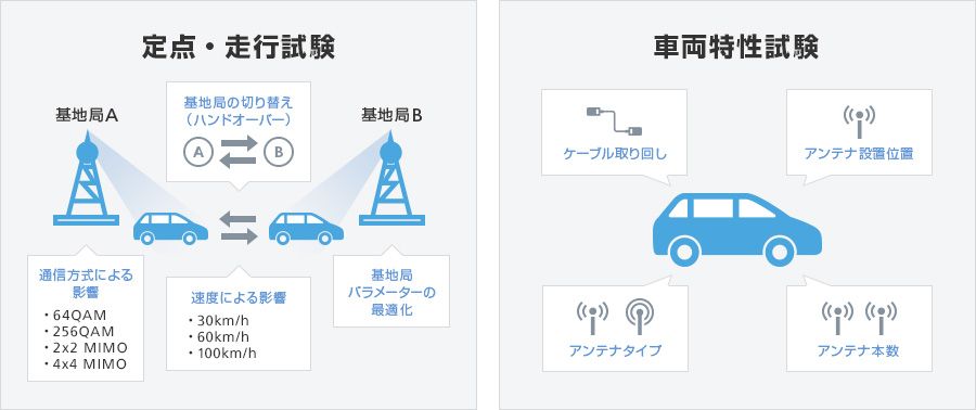 無線検証では停車した状態で、通信方式の組み合わせを変えて品質を検証した。走行試験では車両の速度を30km/h、60km/h、100km/hに変えて、通信方式の組み合わせごとの通信品質や、基地局の切り替え(ハンドオーバー)を検証して最適なパラメーターを探った。ケーブルの取り回しや、アンテナの設置位置、本数、種類なども変えて通信品質を検証し、5G接続での最適な組み合わせを探った。
