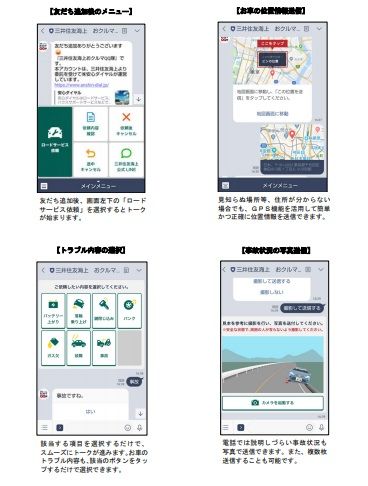 自動会話プログラムであるチャットボット機能を搭載した「LINE」のトークルーム内で質問内容の回答を選択するだけで簡単、迅速なロードサービスの要請が可能になるとしている。対象は三井住友海上、あいおいニッセイ同和損保の自動車保険ロードサービス費用特約をセットし、ロードサービス提供者(安心ダイヤル)にロードサービスを依頼した契約者。