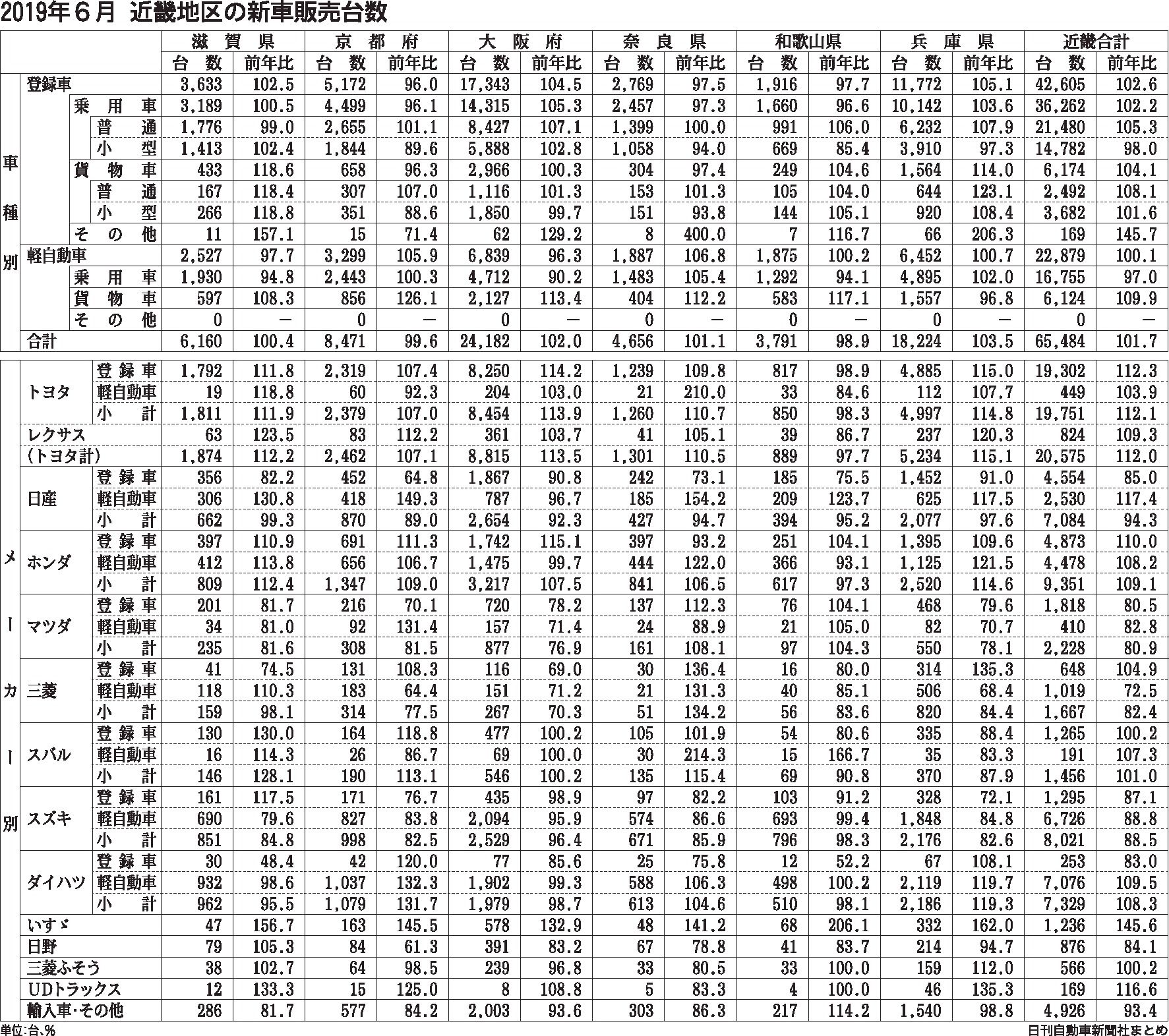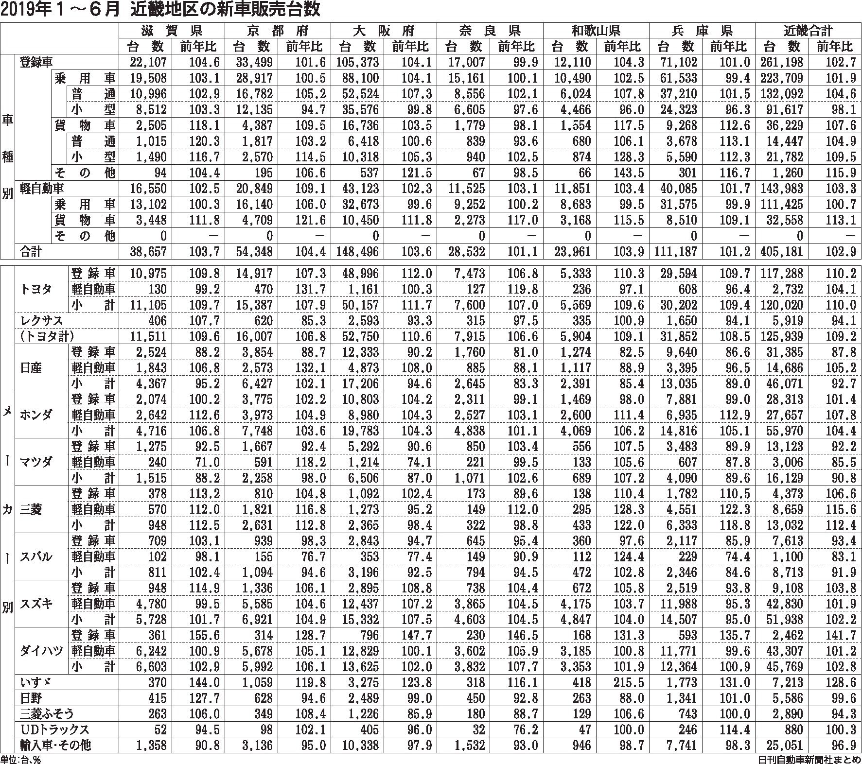 近畿2府4県の2019年上期(1~6月)の新車販売台数は登録車と軽自動車の合計が前年同期比2・9%増の40万5181台となり、上期としては2年ぶりのプラスとなった。登録車は2・7%増の26万1198台で上期として2年ぶりの増加、軽は3・3...