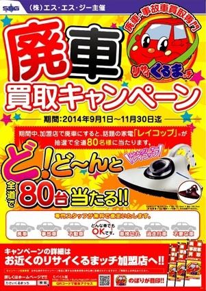 道内廃車買取チェーンのリサイくるまッチ(工藤洋行社長)は、9月1日から3カ月間にわたって懸賞付きの「廃車買取キャンペーン」を実施するはキャンペーンポスター。ラジオCMなどで買い取りを訴求し、抽選で布団クリーナーをプレゼントする。一般ユーザ...