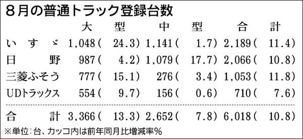 業界筋がまとめた2014年8月の普通トラック(積載量4トン以上)販売は、前年同月比10・8%増の6018台だった。大型は13・3%増の3366台、中型は7・8%増の2652台。建設需要の拡大を追い風に、5月以来4カ月連続のプラスだった。 ...