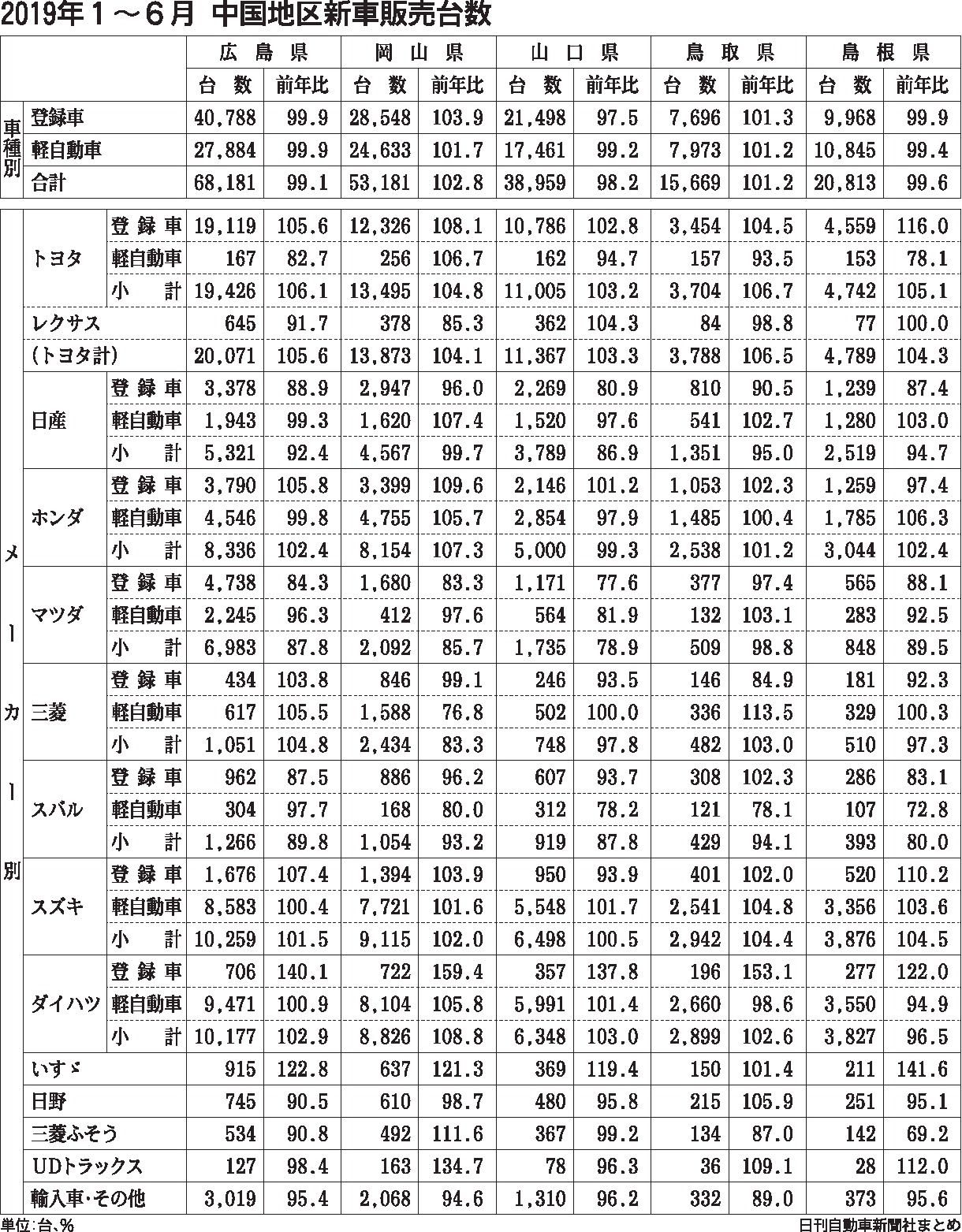 中国地区の2019年上期(1~6月)の新車販売台数は、前年同期比0・4%増の19万7294台となり、2年振りに増加した。登録車が同0・5%増の10万8498台、軽自動車が同0・3%増の8万8796台とともに増加した。新車販売総数に占める軽...