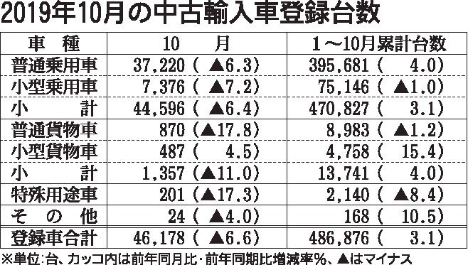 日本自動車輸入組合(JAIA)が13日に発表した2019年10月の中古輸入車登録台数は、前年同月比6・6%減の4万6178台となり、2カ月ぶりに減少した。車種別にみると、小型貨物車を除くすべてで前年同月実績を割り込んだ。特に普通貨物車は1...
