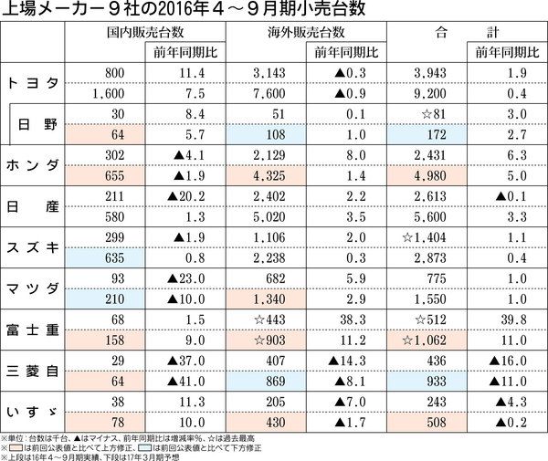 上場メーカー9社の2016年4~9月期世界販売は6社がプラスとなり、スズキ、富士重工業、日野自動車の3社は得意とする主要市場で販売を大きく伸ばして上期としての過去最高を更新した。2017年3月期見通しでは、北米市場の失速をはじめASEAN...