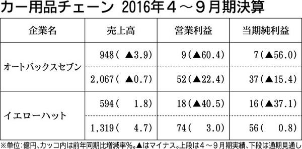 大手用品チェーンのオートバックスセブンとイエローハットの2016年4~9月期(上期)決算は、用品販売が苦戦し、減益となった。昨冬に降雪が少なかった影響を受け、スタッドレスタイヤの販売が低迷した。履き替え需要が減少したことで、上期のタイヤ販...