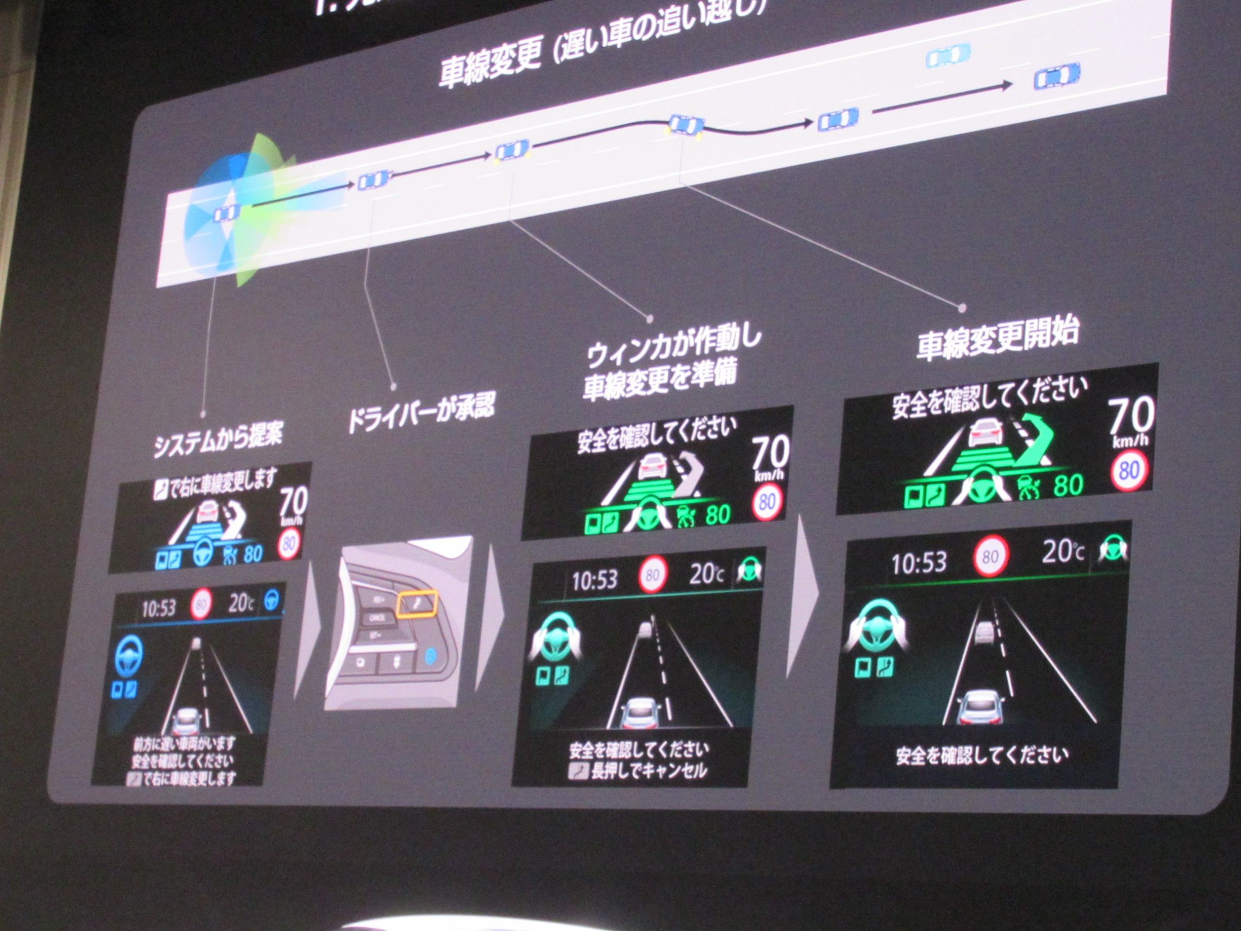 また、自動走行中の分岐や、前方に速度の遅い車が走行している場合の追い越しの際、適切なタイミングをシステムが判断してドライバーに提案する。ドライバーがハンドルに手を添え、承認ボタンを操作すると運転を支援する。同一車線内のハンズオフ走行と、分岐や追い越しの車線変更支援を実用化するのは世界初としている。