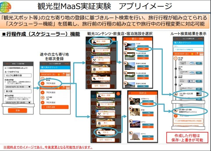 観光型MaaSは、日本国内全域(JR西日本インターネット予約サービス対象エリア)を出発地とし、呉市や福山市などの広島県東部、愛媛県今治市を中心とするエリアを到着地とする。アプリは「観光スポット」の立ち寄り地を登録することで、その間のすべてのルート検索し、旅行行程を作成できる「スケジューラー機能」を搭載している。作成した行程は保存・上書きによる管理が可能で、旅行前の行程の組み立て、旅行中の行程変更にも対応する。