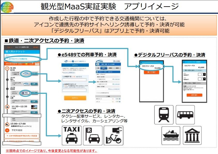実証実験は2019年10月から2020年3月まで。実験はJR西日本が実施主体。ジョルダン、JapanTaxi、電脳交通、タイムズ24、JR西日本レンタカー&リース、しまなみジャパン、ぐるなび、ジェイアール西日本フードサービスネット、日本旅行、瀬戸内海汽船などが参加する。