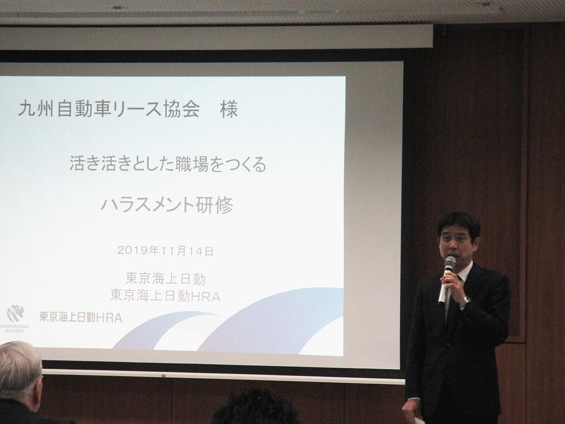 九州自動車リース協会(金子護会長)は11日、福岡市博多区で「第60回セミナー」を開催した=写真。身近な問題であるハラスメントをテーマとしたセミナーには、会員企業から管理職を中心に54人が参加した。 セミナーの冒頭で、同協会の岳野一男事務局...