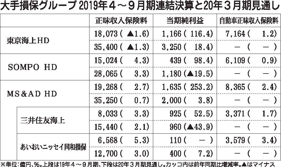 大手損害保険3グループの2019年4~9月期決算が出そろった。台風15号などによる自然災害があったが、前年同期と比べ被害が少なく保険金支払いが少額に収まったため、各社とも増益となった。ただ、20年3月期については、SOMPOホールディング...