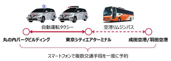 実証実験では、成田空港・羽田空港と東京シティエアターミナル(東京都中央区)を結ぶ空港リムジンバスと、自動運転タクシーを連携することで、両空港から丸の内エリアまでスムーズな移動サービスの提供を目指す。日の丸交通と日本交通が、東京シティエアターミナルから丸の内パークビルディングまでの約3kmを、ZMPが改造したミニバンタイプの自動運転タクシー2台を使って輸送する。JTBはMaaSの視点から空港リムジンバスと自動運転サービスを組み合わせた移動サービス商品を検証する。