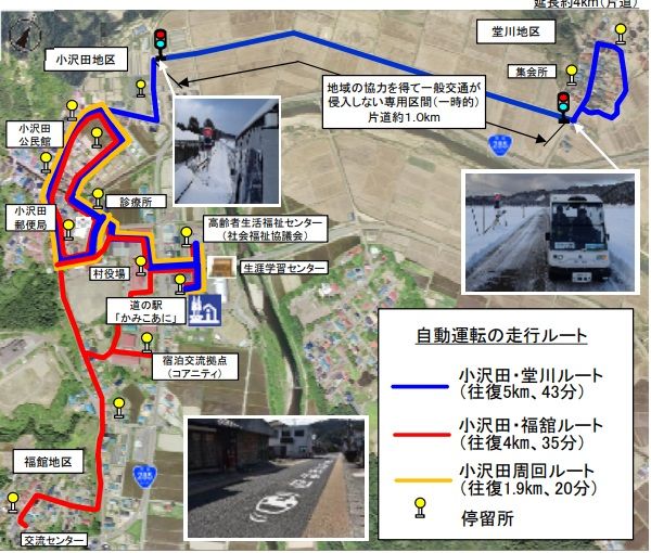 自動運転サービスでは、NPO法人の上小阿仁村移送サービス協会が道の駅「かみこあに」を拠点に、周辺各集落を結ぶ全長約4kmのルートを運行する。地域の協力を得て、一部区間を期間限定で一般車両が進入しない専用空間を確保して実施する。貨客混載して道の駅への農産物輸送、道の駅や地元商店からの商品配送も行う。