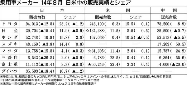 日本の乗用車メーカーによる2014年8月の日本、米国、中国における販売台数がまとまった。国内市場は消費税率引き上げ後の影響でホンダを除く7社が前年実績を下回った一方、米国市場では3カ月ぶりに全社そろってプラスとなり、日産自動車、マツダ、富...