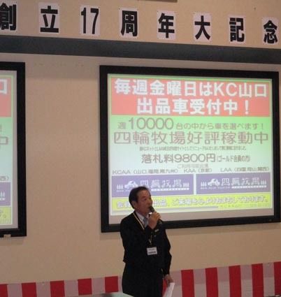 【山口】中古車オークション(AA)のKCAA(大峰高社長)は18日、山口市阿知須町の山口会場で「創立17周年記念AA」を開催した。目標を上回る1600台超えの出品で、活発な競りをみせた。 大峰社長は「記念オークションは1500台の出品を目...