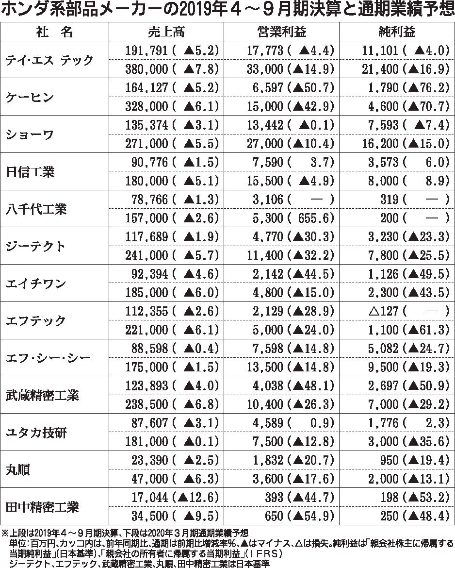 ホンダと取引の多い部品メーカー主要13社の2019年4~9月期決算は、全社が減収で増益は3社に止まる厳しい結果となった。13社合計の総売上高は前年同期比3・5%減、営業利益は同16・2%減、営業利益率は同0・9㌽減の5・7%と全般的に収益...
