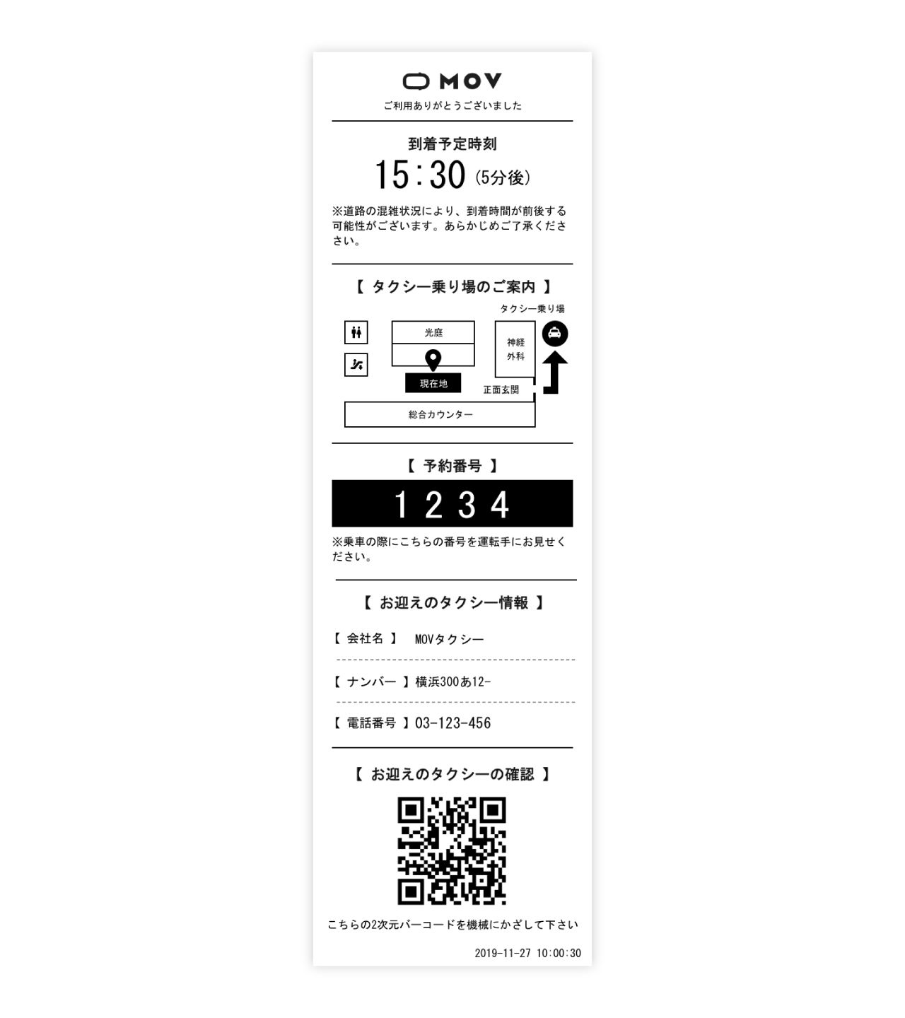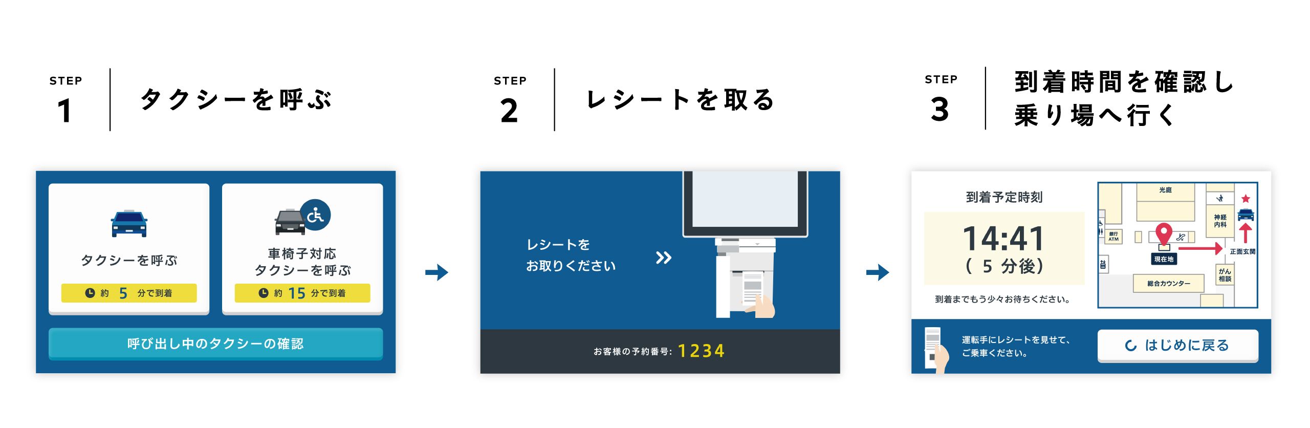 通常のタクシーやユニバーサルデザインタクシーも選択できるほか、周囲のタクシーの現在地に応じた待ち時間の目安もリアルタイムで表示され、配車依頼後、予約レシートに記載の二次元バーコードを読み取らせることで配車状況を確認できるとしている。