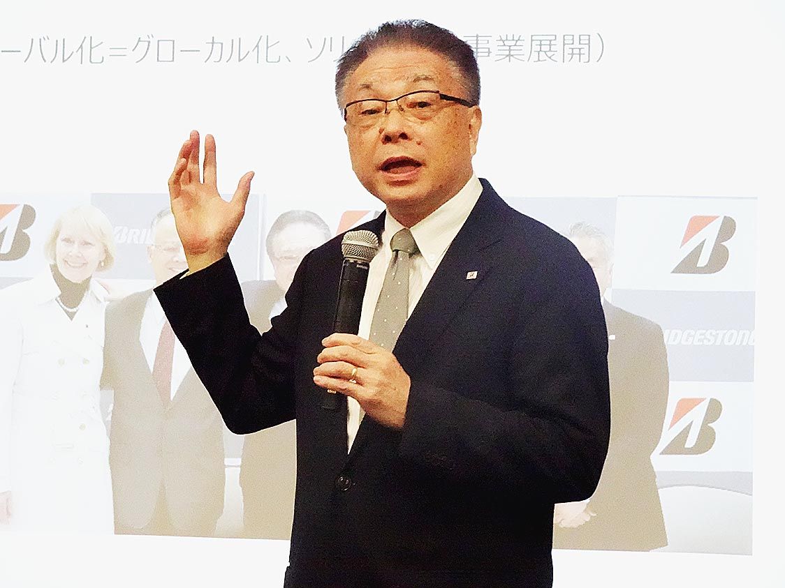 ブリヂストンの津谷正明CEO兼会長は29日、本社で開いた記者会見で、ソリューションサービスを拡大する方針を示した。生産財から消費財にも需要が広がり、「今後はソリューションなしではビジネスが成り立たなくなる」と述べた=写真。製品の性能やメン...