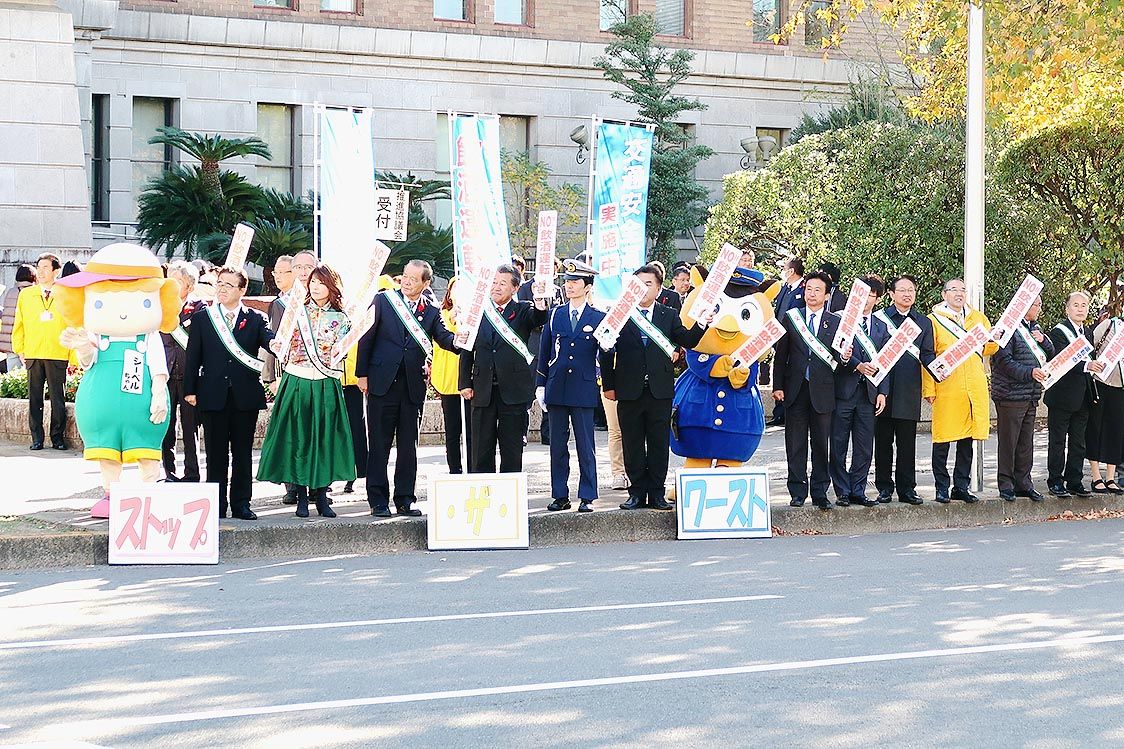 愛知県と愛知県交通安全推進協議会(大村秀章会長=愛知県知事)は11月29日、名古屋市中区の愛知県庁本庁舎で1~10日の「年末の交通安全県民運動」の出発式を開催した。また、出発式後には同運動の啓発キャンペーンを実施=写真。大村知事を筆頭に関...