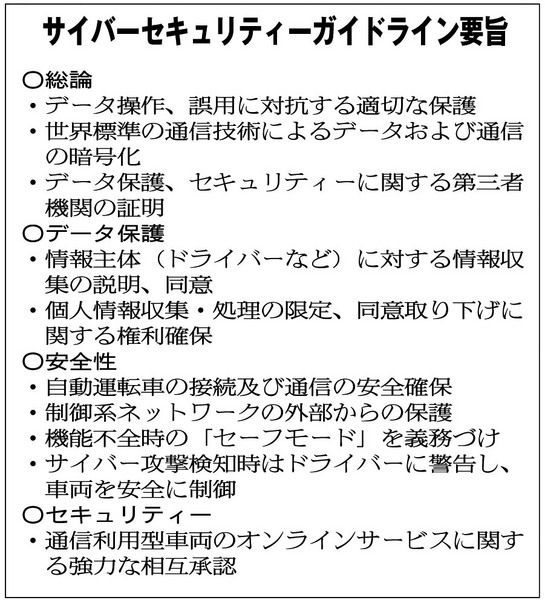 自動車の国際基準を話し合う国連の自動車基準調和世界フォーラム(WP29)は、自動運転車のサイバーセキュリティーに関するタスクフォース(TF)を年内にも立ち上げる。来年3月に成立見込みの基本指針(ガイドライン)の具体化を担う特命組織として活...